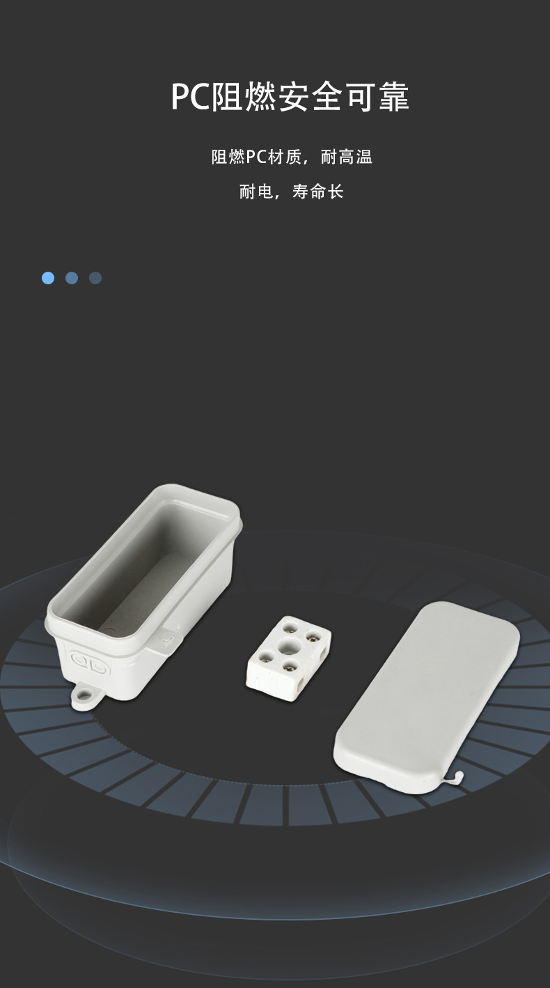 多重密封/安全防水 防水IP等級(jí) (IP44)可供選材料(常ABS)ABS阻燃、PC,合金材PC阻燃安全可靠/耐高溫/耐電/壽命長(zhǎng)每一個(gè)部分都是精心挑選的,只是為了打造一個(gè)好的產(chǎn)品">