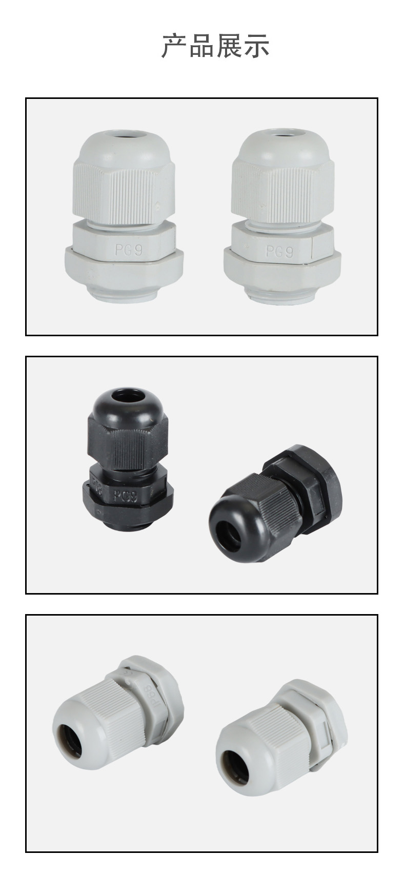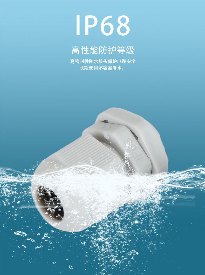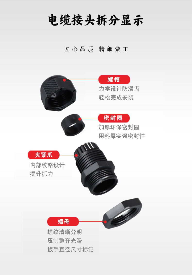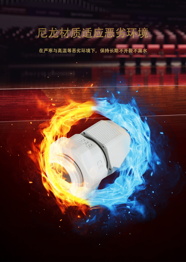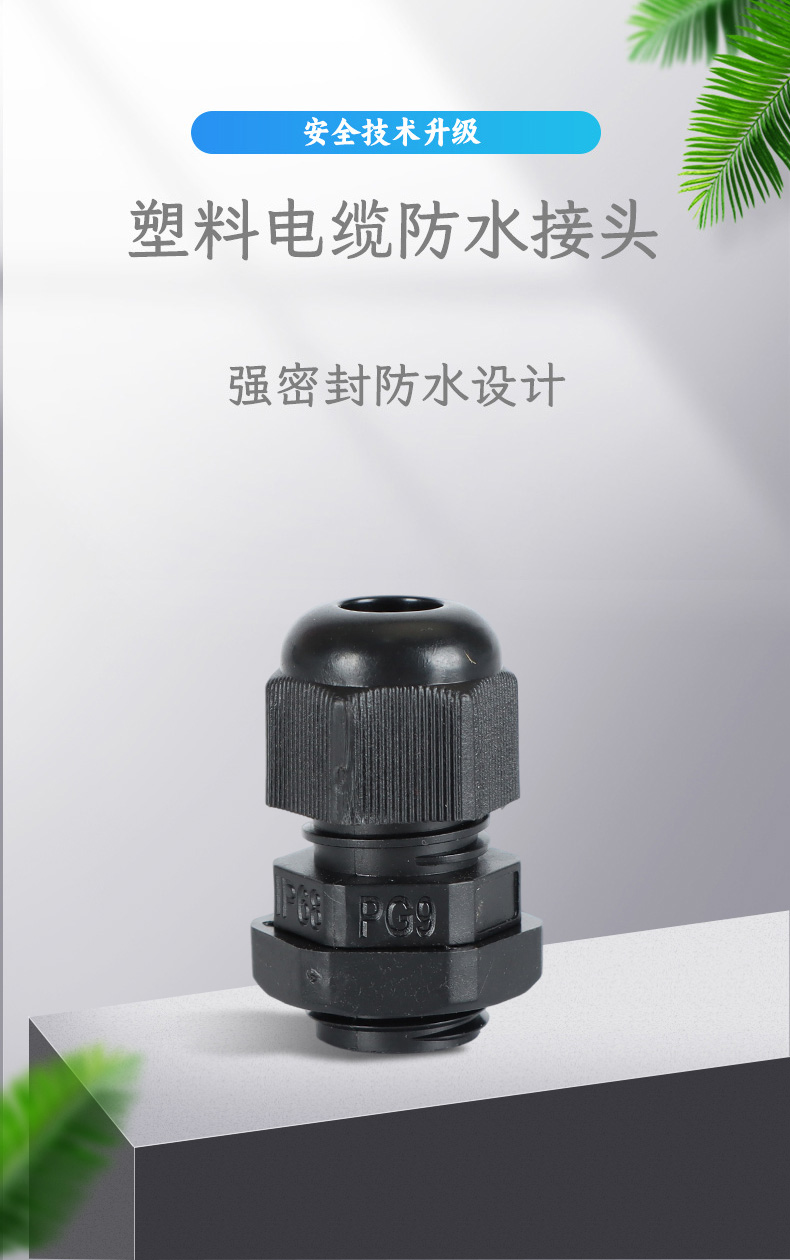 尼龍材質(zhì)適用惡劣環(huán)境紅、灰、黑、深灰、白、藍 六種顏色常規(guī):黑、灰兩種顏色,其它顏色需要定做在嚴(yán)寒與高溫等惡劣環(huán)境下,保持長期不開裂不漏水高密封性防水接頭保護電纜安全,長期使用不容易滲水